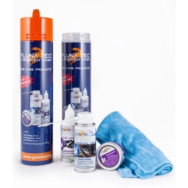 Fluna Tec Gun Care sæt indeholder en GunCleaner, en GunDegreaser, en GunCoating og en microfiberklud. Fluna Tec er det nyeste indenfor våbenpleje og kommer i en samlet pakke så du hurtigt og nemt kan beskytte og smøre dit våben. Fluna Tec anbefales af flere store våbenproducenter som Blaser, Sauer, Mauser, Steyr Mannlicher, Anschütz, Karl Hauptmann og Voere. Så store våbenproducenter anbefaler selvfølgelig kun det bedste af det bedste.