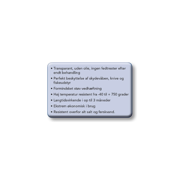 Coatingen har en fantastisk smørrende effekt og er nemt at tørre af, så man ikke efterlader rester. Coatingen giver en langvarig beskyttelse mod slidtage og korrision (rust). Coatingen er en kraftig keramisk belægning til både skydevåben, knive og fiskeudstyr og kan anvendes på alle overflader som f.eks. metal, aluminium, plast, gummi, lakeret træ mv. Coatingen kan anvendes på alle våbnets overflader, bl.a. løb, repetermekanismer mv. - Microfiberklud: