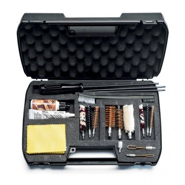 Komplet rensesæt til haglgevær, riffel og pistol i plastkuffert. Dette er et perfekt kombineret sæt til alle dine våben. Passer til kaliber 12 haglgevær, riffelkalibre med 7,62mm (.308 Win) og 9mm pistol. Sættet består af 25 ml. olie, 20 gram fedt i tube, en 3-delt rensestok, 3 uld børster, 3 bronze børster, 2 nylon børster, 1 spiral børste, 2 blårholdere, en adapter samt klude der måler 64 x 85 mm.