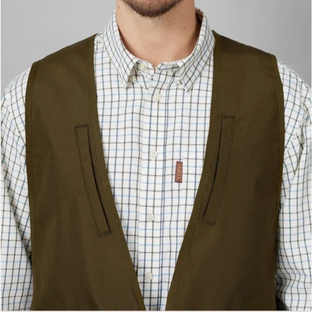 Indeni har vesten en lomme til blankpatroner, en lomme med lynlåslukning til din telefon og som en lækker tilføjelse har vesten også en D-ring i højre til at hægte din hund på. Vesten er lavet af polyestermateriale som gør vesten hårdfør, hurtigtørrende og vindafvisende samt indeni har den et ternet mønstret foer. Du kan justére din vest med det tilhørende justérbare bælt med kliklås – så den passer dig.