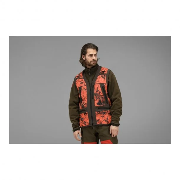 Wildboar Pro Safety Vest fra Härkila er fremstillet i et slidstærkt stof med AXIS MSP® Blaze-camouflage og åndbart mesh-stof, der skaber luftcirkulation i vesten, hvis du dyrker en høj aktivitet. Vesten er udstyret med en 1-vejs-lynlås og flere lodrette og tværgående refleksbånd, så du er sikret ekstra synlighed. Wildboar Pro Safety Vest fra Härkila er udstyret med mange gode lommer, som alle er med lynlåse.